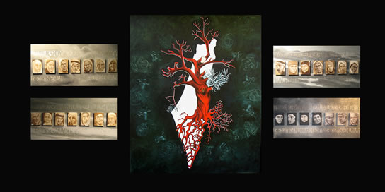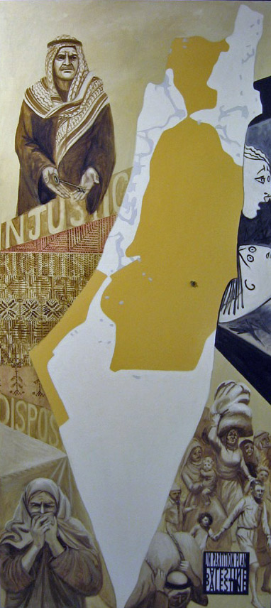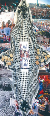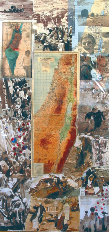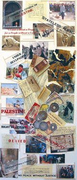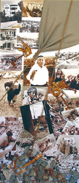 The following seven panels of collage depict the dispossession and struggle of the Palestinian people through symbolic and photographic images. Each panel is presented as parts of a whole, and viewed together, they tell the story of the cumulative disintegration of Palestinian society under the crushing weight of occupation. Yet, despite all attempts to diminish them as a people, the Palestinians have maintained their dignity and strength of purpose. From the very rubble come the stones of resistance because that is all that they have to fight their oppressors. The Palestinians will not be silenced. Their voices are gradually gaining momentum as more and more people world-wide acknowledge the injustice of a people denied the land of their birth and their heritage. Against the tyranny of fabricated lies, truth will prevail and with justice will come peace. The Star of Bethlehem flower is the recurring symbol of that peace as well as symbolising the unrelenting struggle of the Palestinian people against the mighty forces of pen and gun.