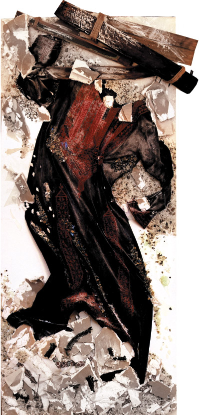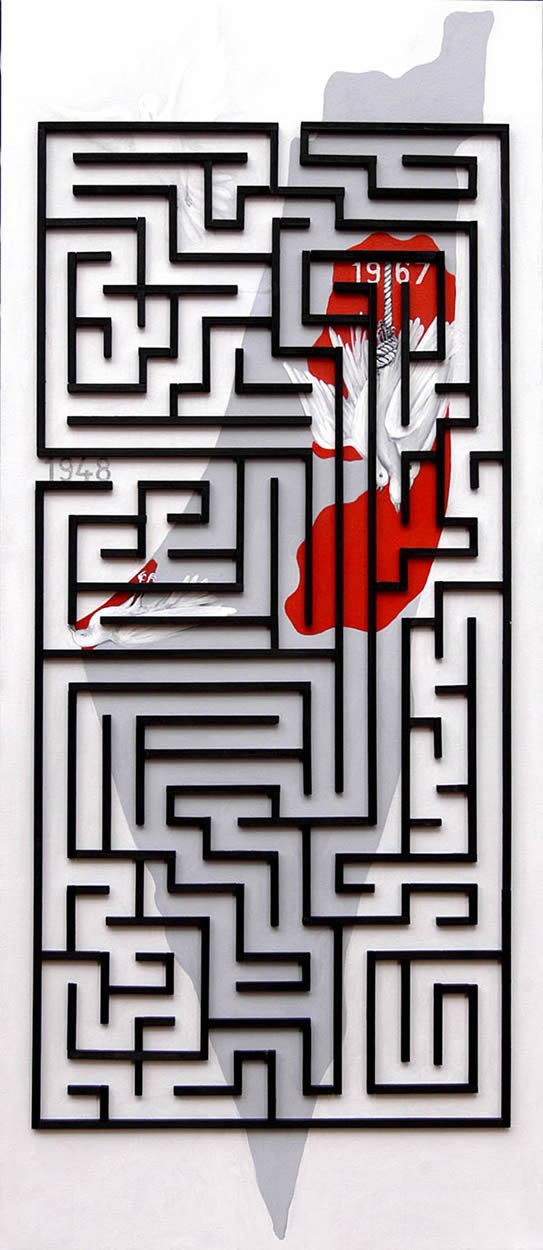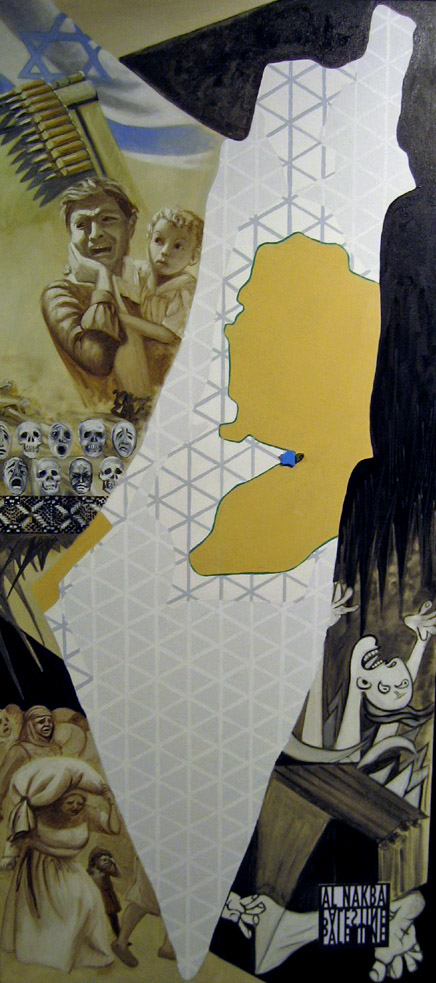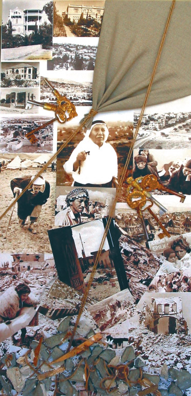 The man-made storm has come with a vengeance and has left nothing but rubble, utter destruction and a traumatised people. As hundreds and thousands of Palestinians flee for their lives, family homes, historic towns and ancient villages are occupied by Jewish settlers from post-war Europe or else razed to the ground. The tent is the refugee shelter – once temporary and now a permanent symbol of housing for refugees in exile. The keys portray those still carried by Palestinians who believe that they will one day be able to unlock the doors of their former homes now occupied without leave by strangers. And while the argument continues that the Palestinians sold or voluntarily left their homes and land, it is inconceivable that of a 700,000 population, every homeowner and landholder would have acquiesced in selling their homes - or more significantly their homeland - at any price in order to live in permanent exile. A lone flower spouting through the rubble is dwarfed by the sheer scale of destruction yet is a plaintive symbol of hope for a return to the lush fields and peaceful land of pre-1948 Palestine. |