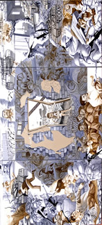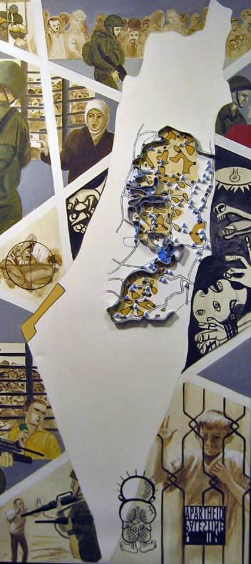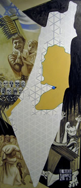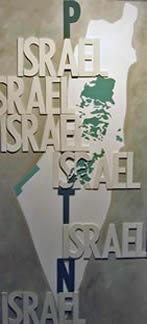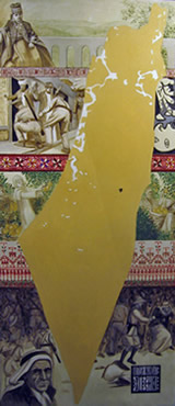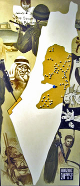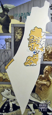 This panel shows the movement of people against the permanence of an ancient land. It depicts the flight of the Palestinian people in 1948 as Zionist forces mount their attack and then again in 1967. Those who remain are effectively prisoners in the West Bank and the Gaza Strip – territories allocated to the Palestinians in the Partition Plan of 1947. However, even these territories are overwhelmingly populated by foreign settlers - Jewish immigrants from Europe, America and Africa who are being encouraged and financially assisted to settle in a land denied to the original inhabitants. A copy of a rare map signed by Moshe Dayan clearly shows that Palestine, in fact, was recognised in cartography contrary to assertions by Zionists that it never existed as a land under that name. The horror, disbelief, anguish and despair of a people dispossessed of their land are etched beneath transparent and shifting maps. Despite the will and might of foreign forces, the spirits of a wronged people continue to haunt this troubled land. |