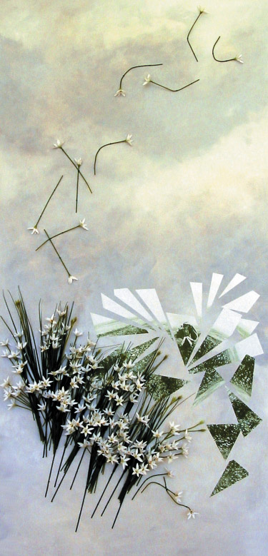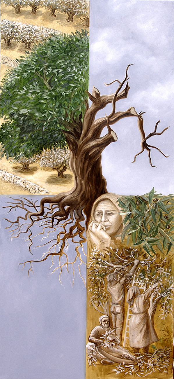 This panel symbolically shows what once was in Palestine and the beginnings of disintegration and dispersal. The fragmented picture is a scene of the fields of Bethlehem in springtime before 1935. Once green and fertile fields covered with the Star of Bethlehem flower are no longer scenes of rural delight. Instead, the flowers have been cut from their roots and have been left to disperse like the people of Palestine. However, the flowers don’t disperse easily because there are so many of them and neither do the people. What is not shown is the horror yet to come. In effect, this panel depicts the calm before the storm and symbolises the peaceful land to which Palestinians everywhere ache to return. |