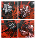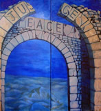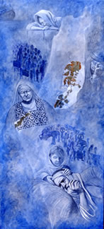 After 60 years of occupation, disenfranchisement, oppression, vilification, wanton destruction and displacement, the voices of the Palestinian people have not bee stilled. Instead they are raised even more strongly today than in those early years when few could believe that not only their country, but the very word Palestine would be systematically and deliberately erased from the pages of history. The shock waves running through the one and a half million Palestinian population when the Partition was announced in 1947, is finally gathering momentum. Protests are resonating around the world to end the oppressive and brutal occupation of the Palestinian people, despite attempts to portray them as troublemakers and terrorists. The stone in a bloodied hand is their only weapon against far more powerful forces. This time the Hebrew story of David and Goliath plays itself out again in a reversal of roles - Palestine as David and Goliath as Israel and the Western world. This panel, against a backdrop of protests, depicts the symbols of the Palestinian struggle – the stones, the flag and the black and white keffiyeh. And, amidst the stones, the Star of Bethlehem flower is seen emerging – a sign that hope and the quest for peace are never entirely eradicated from the human condition. Perhaps a free and recognised Palestine is not such an impossible dream after all. |