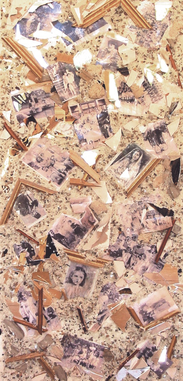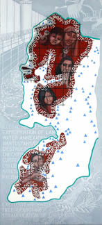 Photographs are permanent memories and for many it is all they have left as proof of their past lives in Palestine. This panel attempts to capture the human faces and special moments in the lives of Palestinians who have the same dreams and hopes as all people everywhere, but instead, those hopes and dreams and memories have been smashed and ground into the rubble of wanton destruction. Shards of mirrors reflect fleeting glimpses of all who look on, a reminder that we are no different to the humanity staring out at us from a now shattered past. Those pictures, once framed, marked the milestones in the lives of men, women and children who went to school, played sport, studied at university, and got married. Those pictures captured the moments of celebration and gladdened the hearts of loved ones. They were displayed, like yours and mine, on mantelpieces and tables or hung on walls - records of lives, of lives interrupted and lost. Some pictures are preserved in the meagre belongings of those Palestinians who fled the falling bombs and advancing forces, but others have had no chance of saving even themselves against the invading tanks. And so, the frameless pictures lie unclaimed, yet still a testament to the lives once lived in Palestine. |